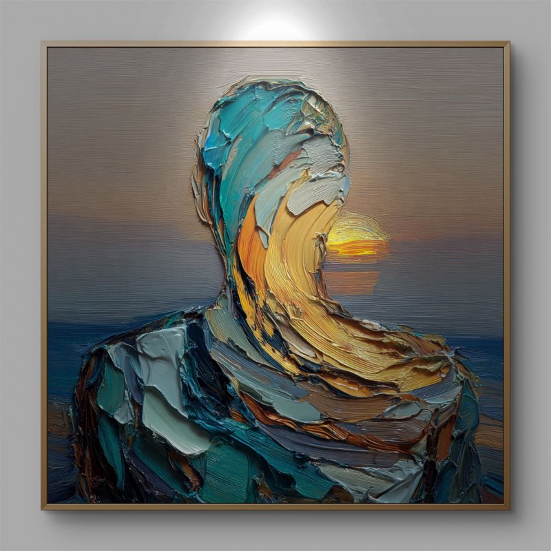 Facing the Horizon is a contemporary abstract portrait that explores introspection, transition, and quiet determination. The faceless human figure turns toward a glowing sunset over the sea, rendered through expressive, sculptural textures and layered brushstrokes. Cool teal and deep blue tones merge with warm amber light, symbolising balance between inner calm and emotional depth. The absence of facial features invites the viewer to project their own thoughts and feelings, making the artwork deeply personal and reflective.