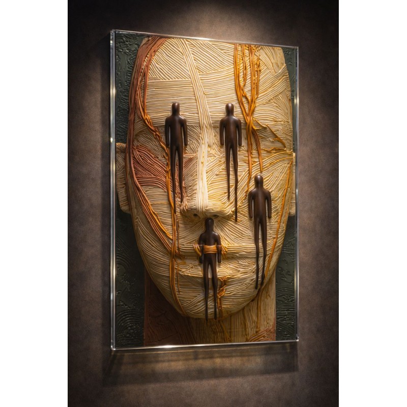 A conceptual artwork portraying a human face formed by organic lines and intersected by stylized human figures. The composition symbolizes the complexity of the human mind, identity, and the many inner voices that shape our perception of the world. Sculptural textures and warm tones create depth and a gallery-like artistic presence. This striking piece perfectly complements contemporary interiors, creative studios, art spaces, and modern design environments.